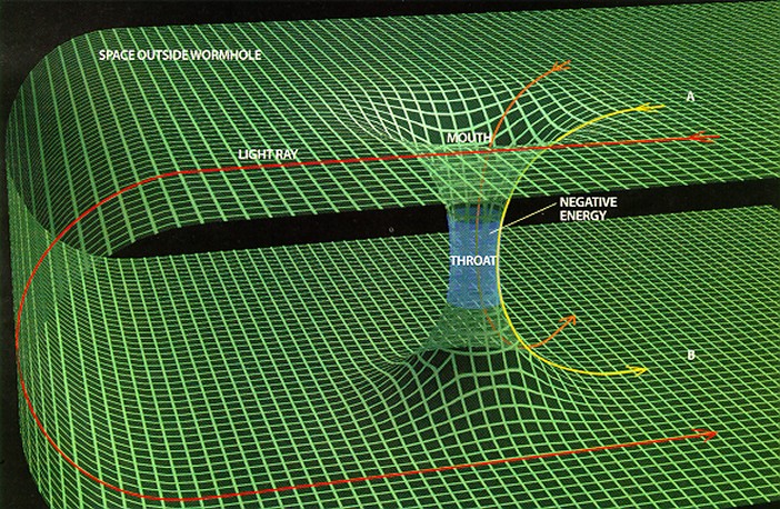 Although Schwarzschild wormholes are not traversable in both directions, their existence inspired Kip Thorne to imagine traversable wormholes created by holding the “throat” of a Schwarzschild wormhole open with exotic matter (material that has negative mass/energy).[citation needed]